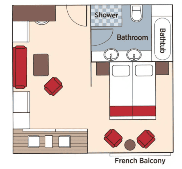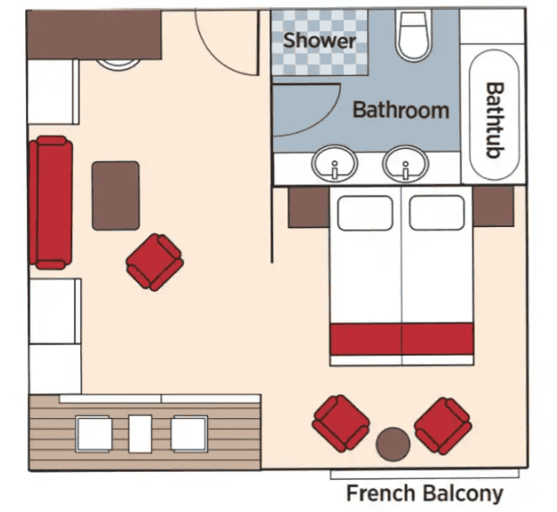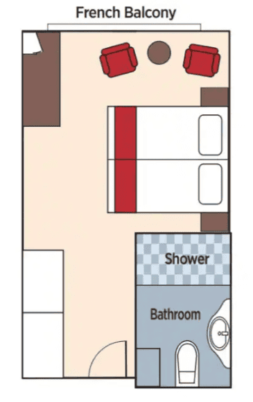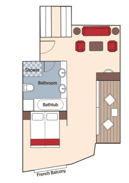 215 sq ft – Including a French balcony, and beautifully appointed with deluxe amenities, including hotel style bedding that can be converted from one to two beds, individual temperature control, safe deposit box and much more.