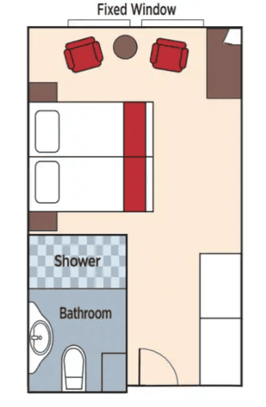 215 sq ft – Including a fixed window, and beautifully appointed with deluxe amenities, including hotel style bedding that can be converted from one to two beds, individual temperature control, safe deposit box and much more.