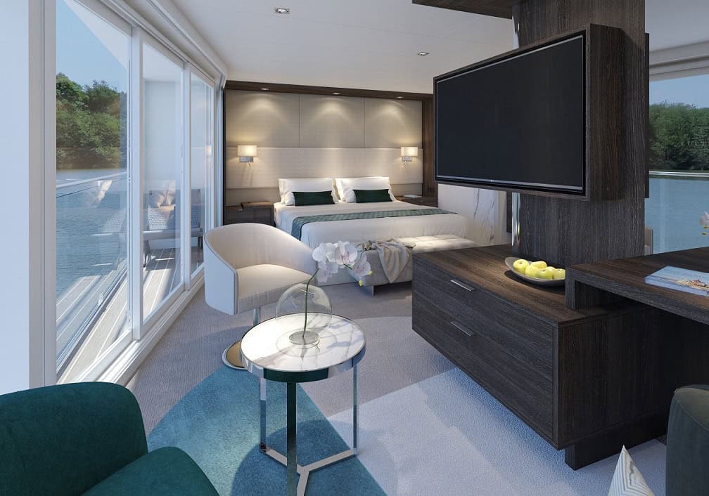 B-4 cabins are 188 sq. ft. with drop-down panoramic window, mini-bar, walk-in wardrobe, choice of bed configuration (double or twin bed), flat-screen television with infotainment center, individual climate control, en-suite bathroom with shower/WC, hair dryer, direct dial telephone and in-room safe.